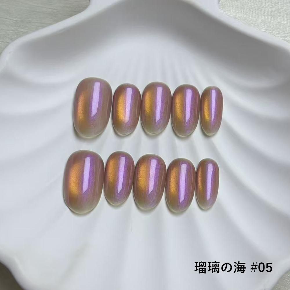 まるで宝石を指先に纏うような、気品あふれるマグネットネイルチップ。角度によって変化する光が奥深く輝き、しっとりとした潤いをまとったような艶めきが上品な存在感を放ちます。瑠璃の名にふさわしい透明感と光沢を持つ全10色のコレクションは、繊細な輝きの中にそれぞれ異なる個性を宿し、手元を優雅に彩ります。